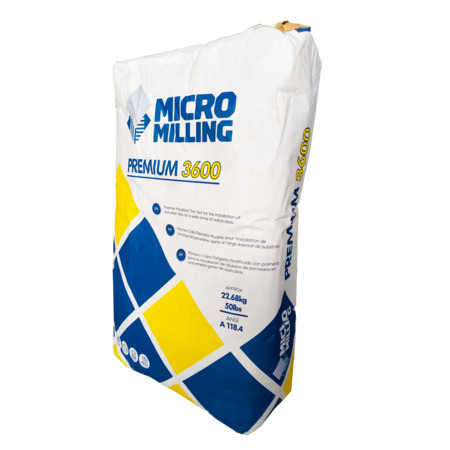 Micromilling 50-pound premium 3600 porcelain thinset is a polymer-modified mortar crafted for professional installations of porcelain tiles on various substrates. Its advanced formulation offers superior bond strength, flexibility, and resistance to moisture, ensuring long-lasting results in high-traffic areas. Ideal for interior and exterior applications, it provides exceptional coverage and reliability. FEATURES - Polymer-modified for installing porcelain tiles on a wide array of substrates - High bond strength, flexibility, and moisture resistance - Suitable for interior and exterior tile installations