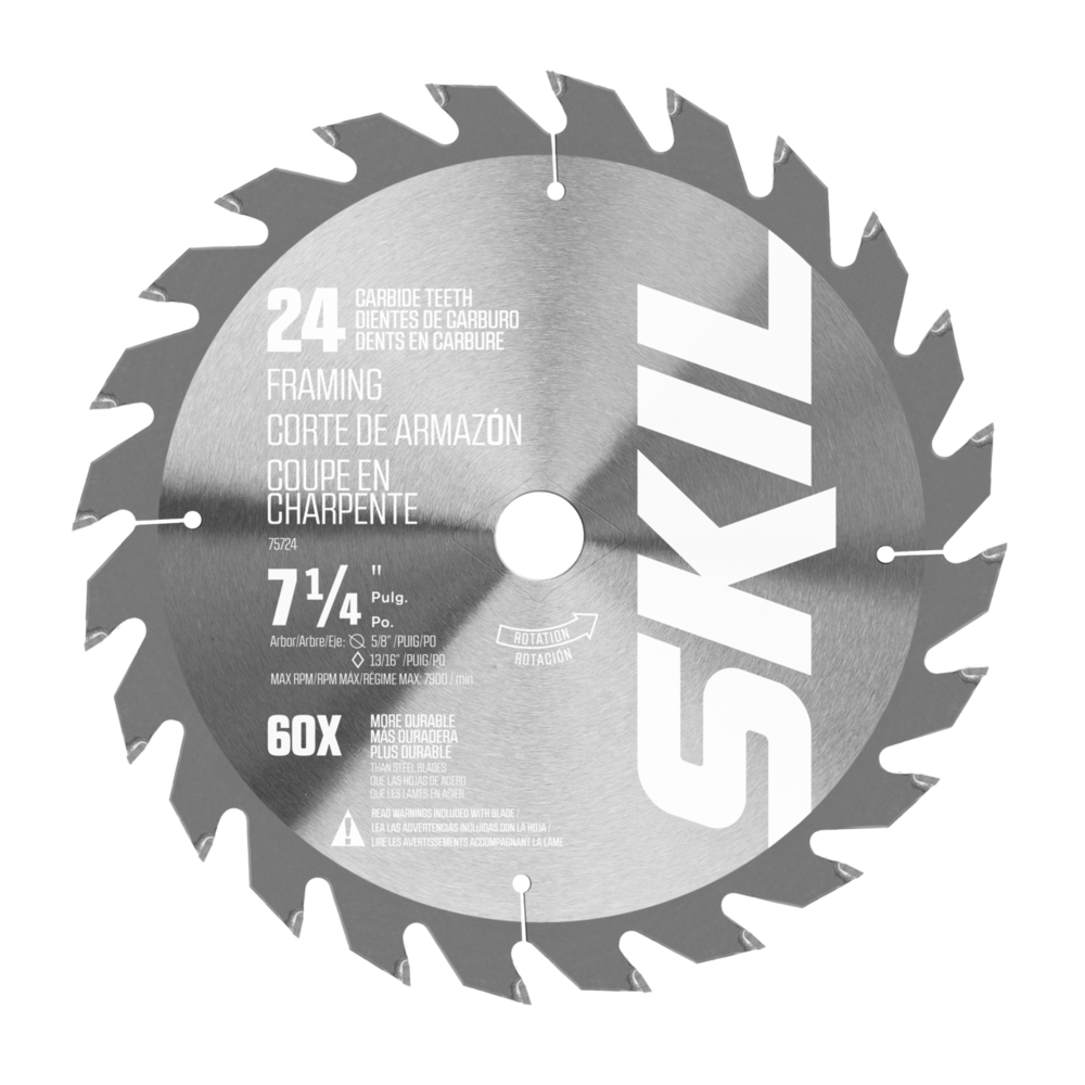 Whether you are cutting plastic, composite decking, wood, plywood, or melamine, make quick work rips and crosscuts with the SKIL 7-1/4 In. 24-Tooth Carbide Tipped Circular Saw Blade. This circular saw blade features induction-hardened alternating top bevel carbide teeth are designed to stay sharp and prolong the life of your cutting edge, and a clear, anti-stick coating reduces friction and heat with less bogging down. The coating also prevents rust and oxidation, keeping the blades fresh and ready for use. A thin kerf gets the circular saw blades spinning faster, easier for optimal performance, while expansion slot cutouts reduce vibration and ensure the blades run straight and true. The diamond knockout arbor allows you to choose between a traditional 5/8-inch arbor or diamond-shaped knockout for compatibility with a wider range of corded and cordless circular saws for framing and general purpose cutting.