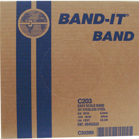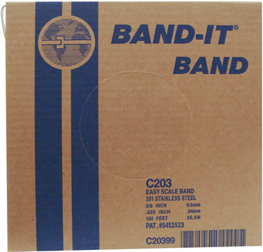 This is the standard choice of BAND-IT products, offering very high strength, clean appearance and good resistance to oxidation and weathering. This non-magnetic material is the choice for municipal and industrial markets. Now with EASY SCALE®, a patented imprint on the band to determine band length. Eliminates costly waste and complicated measuring by allowing users to quickly and precisely roll out the length of band needed for any clamp. No more guesswork!