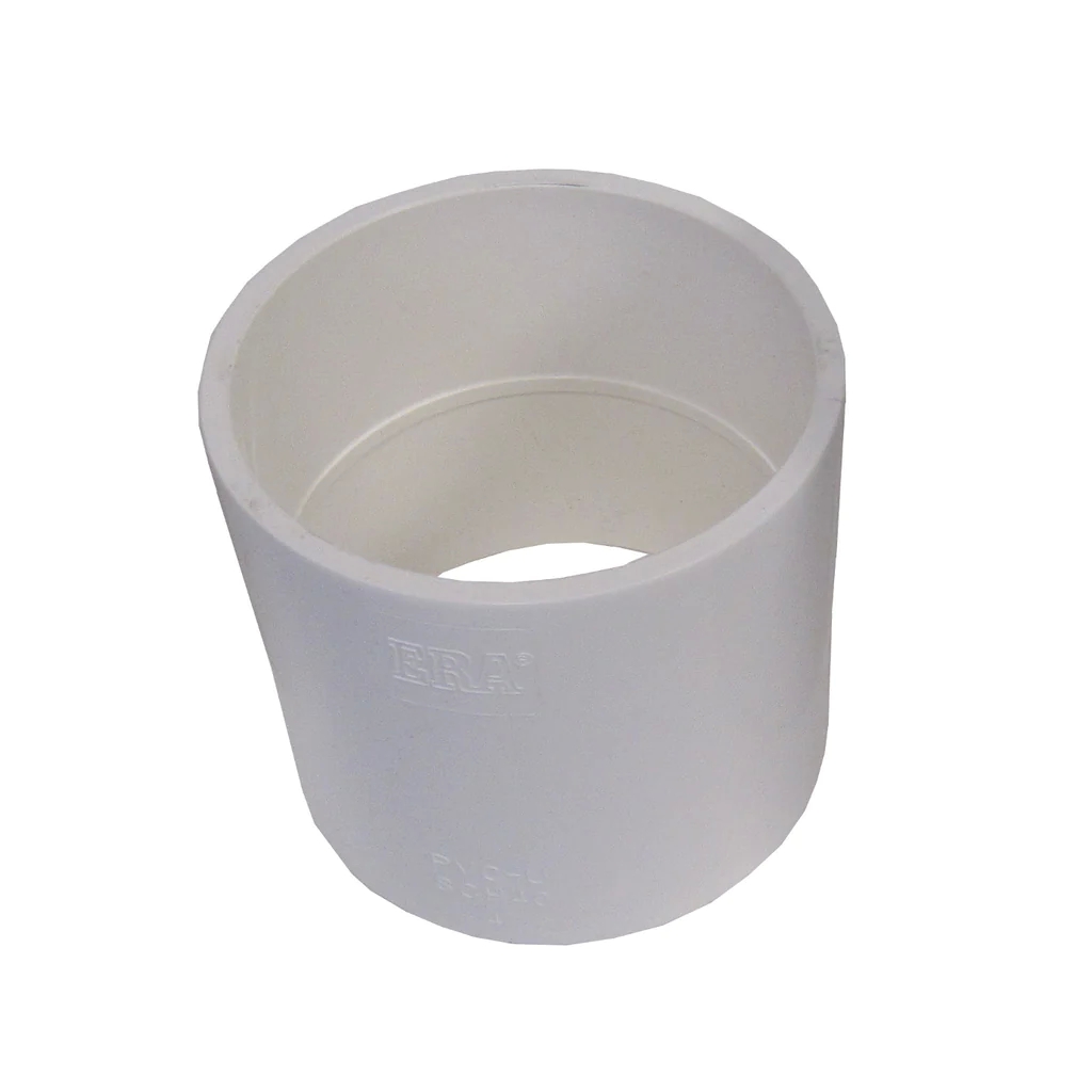 Schedule 40 PVC collar used for joining or repairing pipes. Fits 3-inch diameter pipes (76.2 mm). Provides a secure and leak-proof connection in plumbing installations.