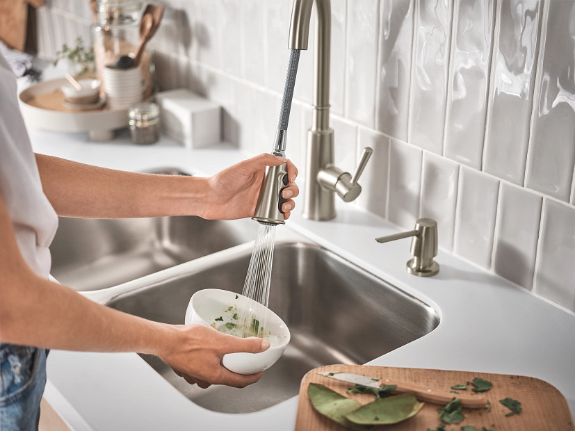 - Equipped with the Reflex system for smooth operation, easy movement and secure docking of the pulldown/pullout spray head.